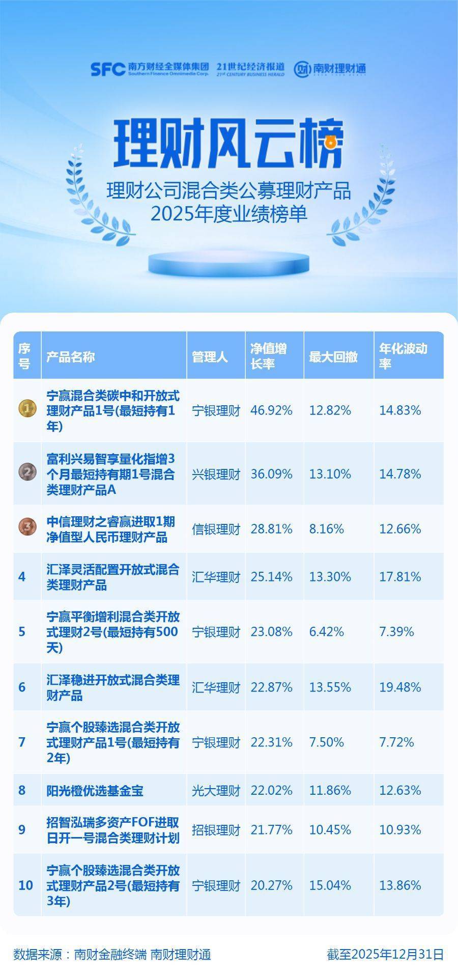 产品统计范围为理财公司发行的公募混合类产品(投资周期不限),统计截止日期为2025年12月31日,统计区间为2025年度。